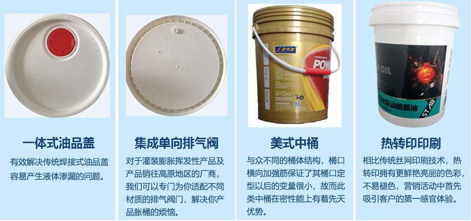 我們?yōu)榭蛻?hù)提供膨脹性液體的排氣解決方案,解決液體肥料膨脹問(wèn)題以及油品運往高海拔地區時(shí)的桶內壓力變化問(wèn)題;提供塑料制提手,握感更為舒適且承重能力大幅提高;一體式包圍油品蓋,解決傳統焊接小蓋滲漏問(wèn)題;配套為客戶(hù)提供桶身絲網(wǎng)印刷及更為高檔的熱轉印印刷方案。